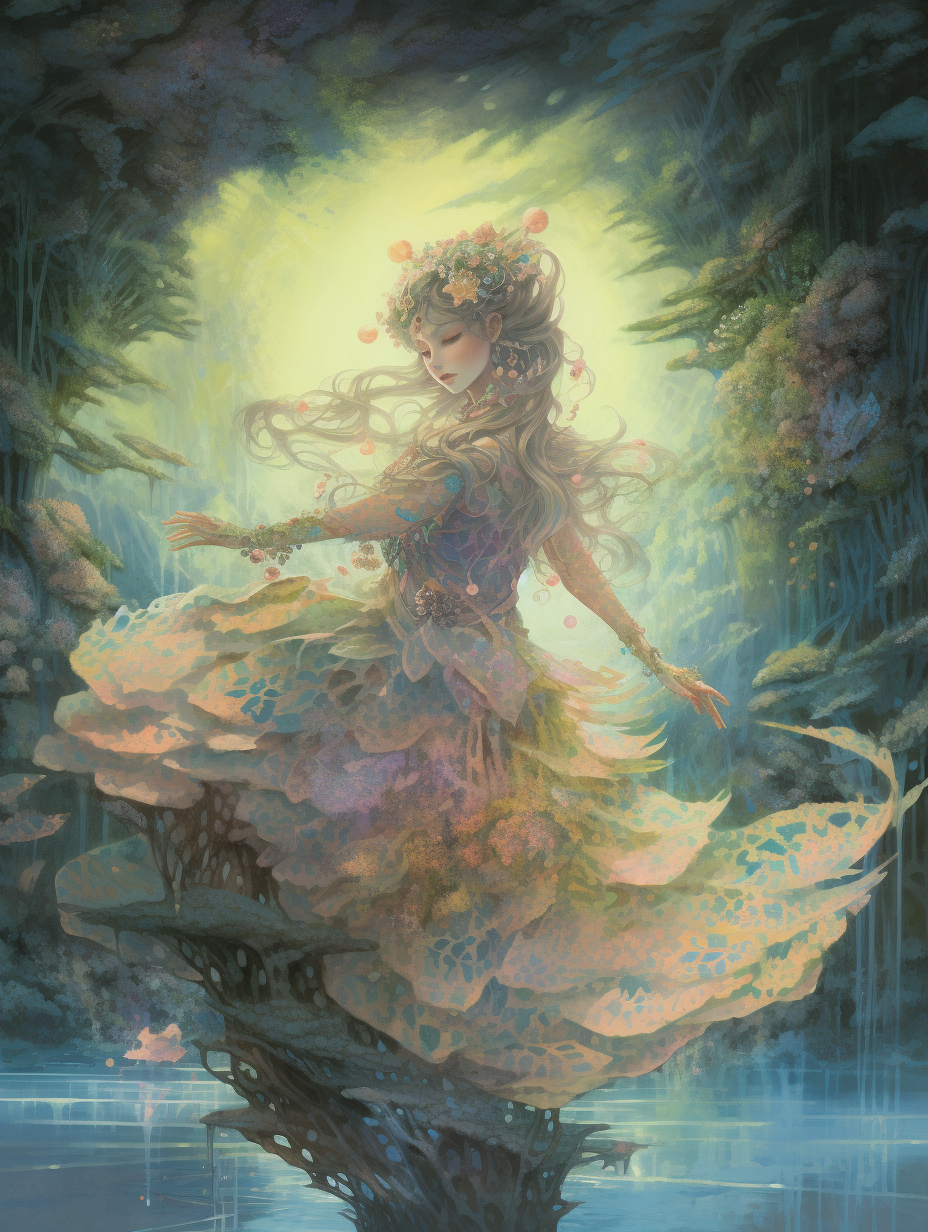 七日ごとに霧散し、また同じ姿に集まり直す“時巡りの織音”は、まるで虹色の呼吸そのもの。背中の螺旋の光輪が、誕生と崩壊の瞬間を同時に映すというのだから、ちょっとだけ世界の裏側を覗かれている気がして落ち着かない。でも当の妖精は、ただ静かに微笑んで、どこかで終わりゆく命の最後のきらめきを拾い集めているだけらしい。